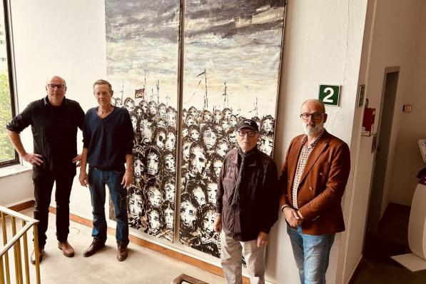 Oostende / Kunst Oostende / Kunst Bekende kunstenaar Ernst Kraft (72) schenkt groot schilderij aan stad Oostende Zopas schonk de Nederlandse internationaal gerenommeerde kunstenaar Ernst Kraft (72) een tweeluik ‘Zelfportret tussen vreemden en maskers’ aan de stad Oostende. Het groot schilderij van 2,5 op 2 meter in acryl op doek is officieel opgenomen in de stedelijke kunstcollectie en hangt nu in de trappenzaal van het stadhuis op de tweede verdieping. 26 mei 2025