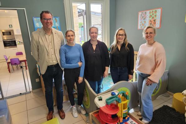 Olsene / Jeugd Olsene / Jeugd Nieuwe kinderopvang Minouchie geopend: “Alle plaatsen direct volzet” Bij gemeenteschool De Vijf Wegen langs de Waalstraat in Zulte is sinds het begin van dit schooljaar een nieuwe kinderopvang open. In Minouchie kunnen vijftien baby’s of peuters terecht. Zij worden opgevangen door onthaalmama Cindy De Lange en haar zoon Emile De Muynck, de eerste mannelijke onthaalouder van Zulte. 11 september 2024