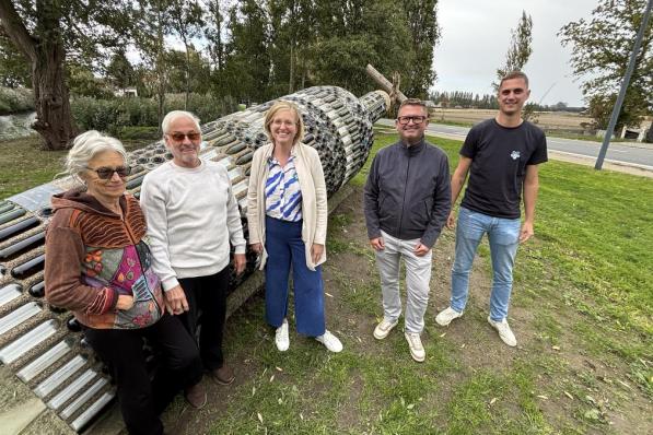 Oudenburg / Kunst Oudenburg / Kunst Kunstwerk ‘Message in a Bottle’ vindt vaste plek in Oudenburg: “Het verbindt menselijke impact met het ritme van de aarde” Aan het Vaardeken staat sinds kort het monumentale kunstwerk “Message in a Bottle”. De installatie, opgebouwd uit duizenden zorgvuldig gereinigde glazen flessen, is een creatie van het Oudenburgse kunstenaarskoppel Carla Metsch en Freddy Coucke. 26 september 2025