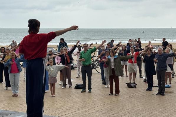 Oostende / Evenement Oostende / Evenement Jotka Bauwens verrast opnieuw met emotionele dans op Zeedijk tijdens Theater aan Zee: “Mensen die dat niet zouden doen toch even doen stilstaan” De dans die choreografe Jotka Bauwens aanleert op Theater aan Zee kreeg een bijzonder karakter want inspirator en Golfbreker Farnoosh Khodadadeh kwam meedansen. “Geïnspireerd op verzen van haar moeder over wat toen en nu in de wereld aan de hand was. Het is ook nu nog actueel”, luidt het. 31 juli 2025