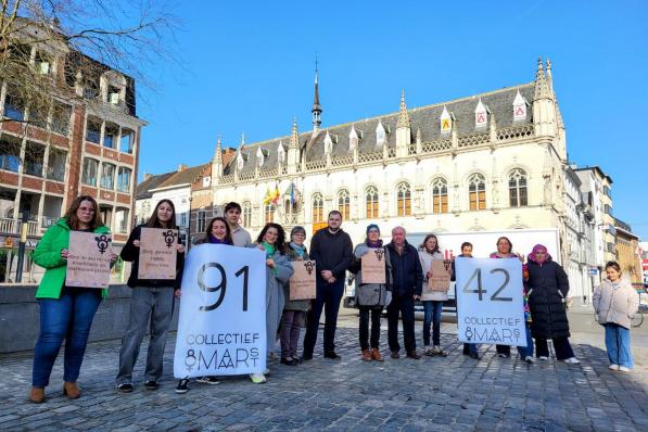 Kortrijk / Samenleving Kortrijk / Samenleving Collecti.e.f 8 maars betoogt op Internationale Vrouwendag: “We zijn er nog niet” Naar aanleiding van Internationale Dag voor Vrouwenrechten op zaterdag 8 maart organiseerde Collecti.e.f 8 maars Kortrijk een teaseractie op de Grote Markt om de schrijnende ongelijkheid tussen mannen en vrouwen in België aan de kaak te stellen. Centraal staan de cijfers 42 en 91, die de harde realiteit van ongelijkheid en grensoverschrijdend gedrag tegen vrouwen blootleggen. 4 maart 2025