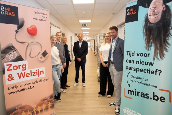Oostende / Onderwijs Oostende / Onderwijs AZ Oostende wordt leerplek voor zorgopleidingen van Ivo MIRAS: “Frisse energie en herinnert ons eraan waarom we ooit zelf voor de zorg kozen” Vanaf dit academiejaar werd een halve verdieping van AZ Oostende-Serruys dé leerschool waar toekomstige zorgmedewerkers hun eerste stappen zetten in een realistische ziekenhuisomgeving. Het centrum voor volwassenenonderwijs MIRAS organiseert er de opleidingen Zorgkundige, Logistiek assistent en ToTAALzorg. Cursisten maken kennis met de ziekenhuisdiensten en hun medewerkers. De bedoeling? Afgestudeerden sneller en sterker voor te bereiden op de stap naar de arbeidsmarkt. 23 september 2025
