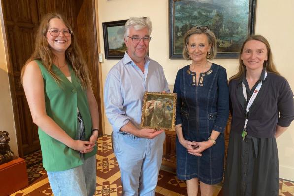 Loppem / Kunst Loppem / Kunst Vergeten Ensor ontdekt in Kasteel van Loppem: “Een mooi verjaardagsgeschenk” In het Kasteel van Loppem is een bijzonder werk van de Oostendse meester James Ensor opgedoken. Het was collectiebeheerder Benoit Kervyn die de olieverfschets - ter waarde van 15.000 euro - ontdekte. “Het werk hing vroeger in het appartement van Roland van Caloen in Cadzand.” 18 juni 2025