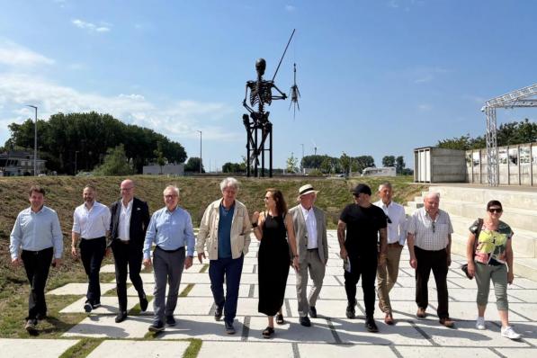Helkijn / Kunst Helkijn / Kunst Van Venetië naar Spiere-Helkijn: monumentaal kunstwerk The Fisherman is hoogste West-Vlaamse landmark Wat vorig jaar nog een van de meest gefotografeerde kunstwerken was op de Biënnale van Venetië, is deze zomer de publiekstrekker aan de betekenisvolle site van het voormalige openluchtzwembad Bassin in Spiere-Helkijn. The Fisherman van kunstenaar Tom Herck - een tien meter hoge sculptuur van een menselijk skelet dat een dinosaurus opvist - wordt een vaste waarde langs de Schelde. Dankzij curator Jan Leysen, de steun van Leiedal en de Provincie West-Vlaanderen, krijgt Zuid-West-Vlaanderen er een indrukwekkende toeristische landmark bij. “The Fisherman is een symbool. We domineren de wereld, maar hoe lang nog?”, klinkt kunstenaar Tom Herck (41) prangend. 10 juli 2025