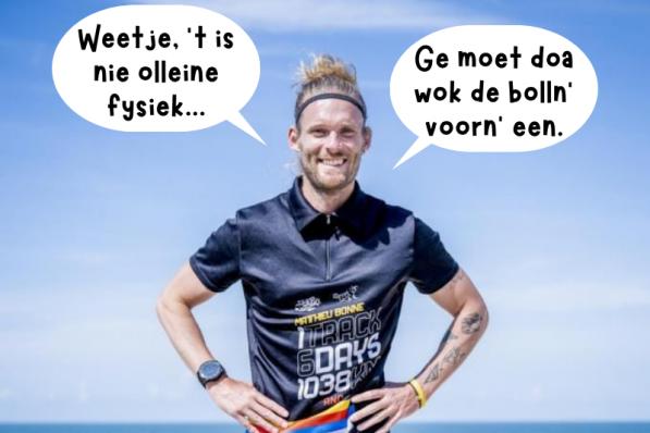 Bredene / Samenleving Bredene / Samenleving “Nee, ik zie mezelf niet oud worden”: Matthieu Bonne wil na nieuw wereldrecord nu ook de Amazone doorkruisen Ultrasporter Matthieu Bonne heeft nóg maar eens een wereldrecord beet. In Hongarije liep hij 1.046 kilometer in zes dagen, een fenomenale uitputtingsslag. De titel van zijn eerste boek, ‘Wilskracht’, is dan ook niet toevallig gekozen. Hoe meer uitdagingen hij aangaat, hoe groter zijn honger en focus wordt. Er lijken maar geen grenzen aan zijn mentale en fysieke capaciteiten. “Als ik met mijn moeder praat over de volgende uitdaging, krijgt ze écht schrik.” 18 september 2024