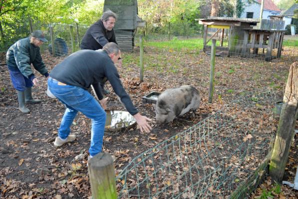 Damme / Natuur Damme / Natuur Rosette van ’t Eikenhof in Moerkerke zoekt adoptieouders voor twee hangbuikvarkens: “Voor de meeste andere dieren is al een oplossing gevonden” Wie interesse heeft in twee flinke hangbuikvarkens mag zich melden bij Rosette De Lille van domein ’t Eikenhof in Moerkerke bij Damme. “Het domein is verkocht dus alles moet hier weg, ook de dieren van de kinderboerderij”, zegt Rosette. “Voor de geitjes vonden we al een nieuwe thuis.” 14 oktober 2025