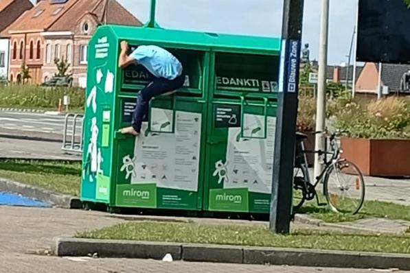 Roeselare / Samenleving Roeselare / Samenleving Omstaander biedt spontaan schoenen aan aan man die in kledingcontainer kroop 4 augustus 2025