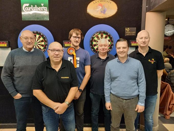 De initiatieven volgen elkaar in snel tempo op bij Dominique Vanhonacker en Sofie Hostens in Snooker Pocket. Vorige zaterdag stond een dartstornooi op het programma. Daarbij werd gebruik gemaakt van elektronische tellers. Gilles Van den Abeele toonde zich met zijn pijltjes de secuurste van de deelnemers en haalde zo de overwinning naar zich toe. Rik Devolder en Frank Naessens eindigden respectievelijk tweede en derde. Op de foto bemerk je van links naar rechts voorzitter van het centraal feestcomité Rudy Verhulst, Rik Devolder, kampioen Gilles Van den Abeele, Frank Naessens, schepen van Feestelijkheden Louis Vanderbeken en Dominique Vanhonacker van Snooker Pocket. (DRD/foto DRD)