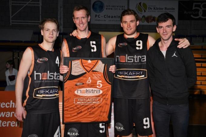Tom richtte zich in zijn dankwoord onder andere tot zijn echtgenote en bedankte haar vooral voor de steun in de voorbije drie moeilijke seizoenen. In een met ongeveer 250 toeschouwers gevulde ‘Schelp’ verloor Holstra de derby waarin Tom 9 punten scoorde met 65-73.