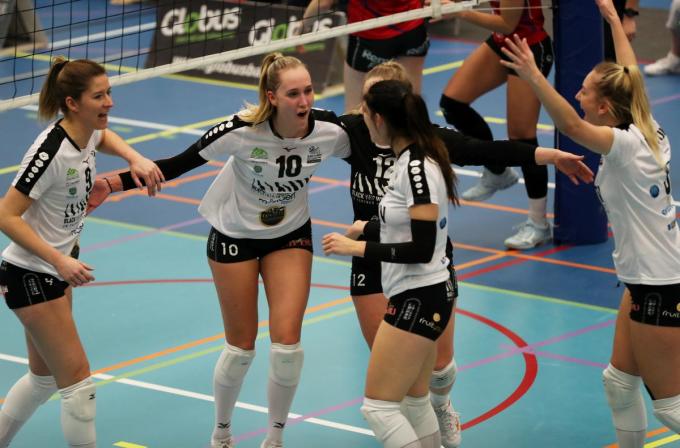 Coach Wittebolle opende in zijn basiszes met De Leeuw aan de spelverdeling, receptie-hoekspeelsters Zwaanswijk en Verrelst, in het midden stonden Sercu en Verhulst met Smeets als opposite en in de liberotrui Voets. Via Verhulst zowel blokkend als in de afwerking kwam de thuisploeg 5-2 voor die eerste beurt maar de bezoeksters namen langs Radovic en een renderend serverende Coppin via 9-8 naar 8-11 over. De score liep wisselend omhoog met aan beide kanten een counterend blok. Smeets sloeg een driepuntenkloof op het bord bij 21-18 en Verrelst strafte een manke receptie af naar 23-19. Die bonus werd door Devos nog naar 23-22 herleid maar via een scorend blok en een outaanval van diezelfde Devos stond de 25-22 op het bord.