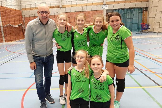 De meisjes U23 van Elckerlyc met staand van links naar rechts: trainer/coach Eddy Vancauwenberghe, Heleen Demare, Nore Vandenberghe, Nore Deruyter en Linke Verhelle. Zittend van links naar rechts: Estelle Deceuninck en Katrijn Tack. (foto WD)