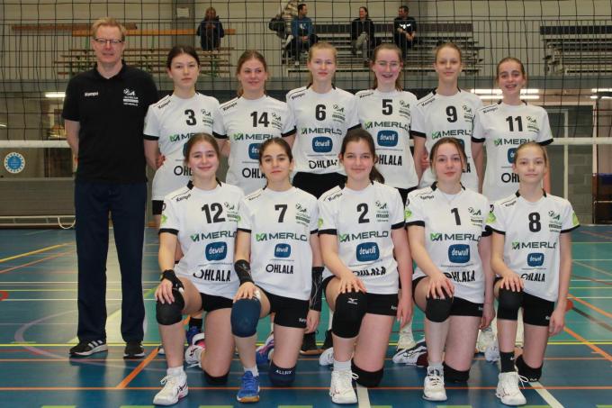We zien de meisjes U15 niveau 2 reeks C (+) van VT Merlo Lendelede met bovenaan v.l.n.r.: trainer Andy Laperre, Giovanna De Lille, Yanaika Devos, Niene Reynaert Vancauwenberghe, Fauve Kemseke, Lotte Vromman en Anna Clarysse. Onderaan v.l.n.r.: Jitske Devolder, Melissa Fatapour, Elena Debyser, Arianna Tremmerie en Ruth Buyse. Ontbreken op de foto: Seren Claeys, Miep Vanneste en Ines Clarisse. (RV/foto RV)