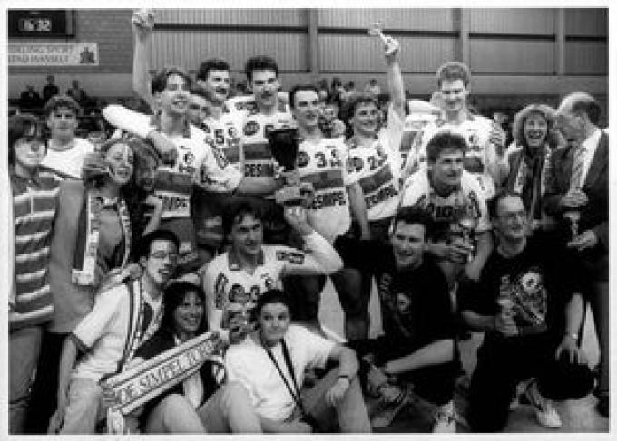 Voorzitter Johan Windels (centraal met sjaal) glundert na de bekerzege in 1995 met Desimpel Torhout. Rechts van hem trainer Vic Ernon, voor hen gehurkt Jan Van Huffel, nu coach bij Marke-Webis.