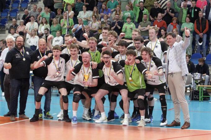 RTH3 van volleybalclub Rembert Torhout Heren is al sinds half november ongeslagen. Dat leverde het team van de coaches Yannick Degrande en Dennis Deblaere de kampioenstitel op in de reeks Promo 1. Nu heeft de ploeg in het sportcomplex Schiervelde in Roeselare ook de provinciale bekerfinale gewonnen en dus meteen de dubbel binnengehaald. In die finale werd Bavo Bavikhove overtuigend verslagen met 3-0. In de eerste en de derde set walste RTH3 over Bavikhove heen. Na de zege werd er een dol feestje gebouwd (foto). Burgemeester Kristof Audenaert (vooraan rechts op de foto) kwam de match bijwonen en de spelers, coaches, begeleiders en bestuursleden namens de stad feliciteren.