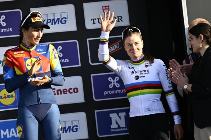 De Italiaanse kampioene knalde op de Huisepontweg naar die twee, liet hen meteen in de steek en mocht in haar eentje aan de laatste 27 kilometer beginnen. Kraak en Reusser werden met nog 12 kilometer te rijden opgeraapt door een groep met 16, waarna Kopecky, Mischa Bredewold, Balsamo, Elise Chabbey, Pieterse en Niewiadoma even uit de grote groep wegglipten. Longo Borghini kwam niet meer in de problemen, Kopecky regelde de dichtste ereplaats na een sprint met een omvangrijke groep.