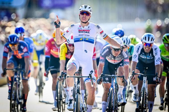 “Ik wachtte op deze aankomstfoto, met de trui van Europees kampioen. Die ga ik misschien wel een speciaal plaatsje geven thuis”, glunderde de spurtbom van Soudal Quick-Step aan de finish. “Omdat het zo’n goed weer was, had ik voor de gelegenheid ook mijn witte broek aangetrokken. Dat maakt het net nog iets meer af, vind ik. Maar dat geldt niet voor iedereen binnen de ploeg (lachend).”