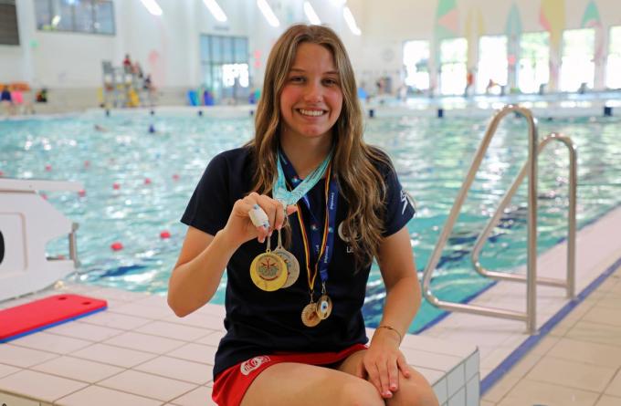 Nadat ze de basis van school-, rug- en vrije slag onder de knie kreeg, schakelde Lisa Thomas (14) uit Aartrijke over naar het synchroonzwemmen ook wel artistiek zwemmen genoemd. “Er volgde een jaar waar ik enorm veel vooruitgang boekte. Daarna zag ik de keerzijde van de medaille in een jaar waar ik het mentaal wat moeilijk had en zelfs zin had om te stoppen. Ik heb doorgebeten en nu gaat alles opnieuw vrij goed”, vertelt de kunstzwemster van BZK. In 2022 behaalde Lisa op het BK miniemen (U12) de bronzen medaille in de categorie solo. Dit was de aanzet naar meer. “De voorbije maanden werd ik solo Vlaams kampioen en won ik met de Belgian Wolf Cup mijn eerste internationale wedstrijd. Iets wat ik totaal niet had verwacht. Daarna trok ik naar Malta, waar het niveau hoger lag dan in eigen land. Ik deed er veel ervaring op. Solo werd ik er eerste en tweede voor mijn figuren. Op zich een zotte prestatie”, vindt Lisa. “Ik had er wel veel voor getraind en mijn coach Sigrid Vergauwe liet mij weten dat ik er klaar voor was.”