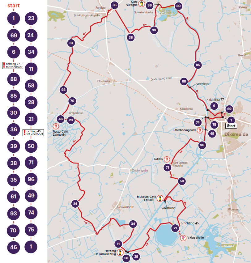 Diksmuide is dé stad aan het water, en dat beleven we volop in een unieke fietstocht door het onmetelijke vlakke polderland rond Diksmuide. We fietsen niet alleen langs de IJzer en talrijke kleine en grotere vaartjes, we steken ook twee keer de IJzer over met de gratis veerboot. En aan rustpunten onderweg geen gebrek in deze tocht!